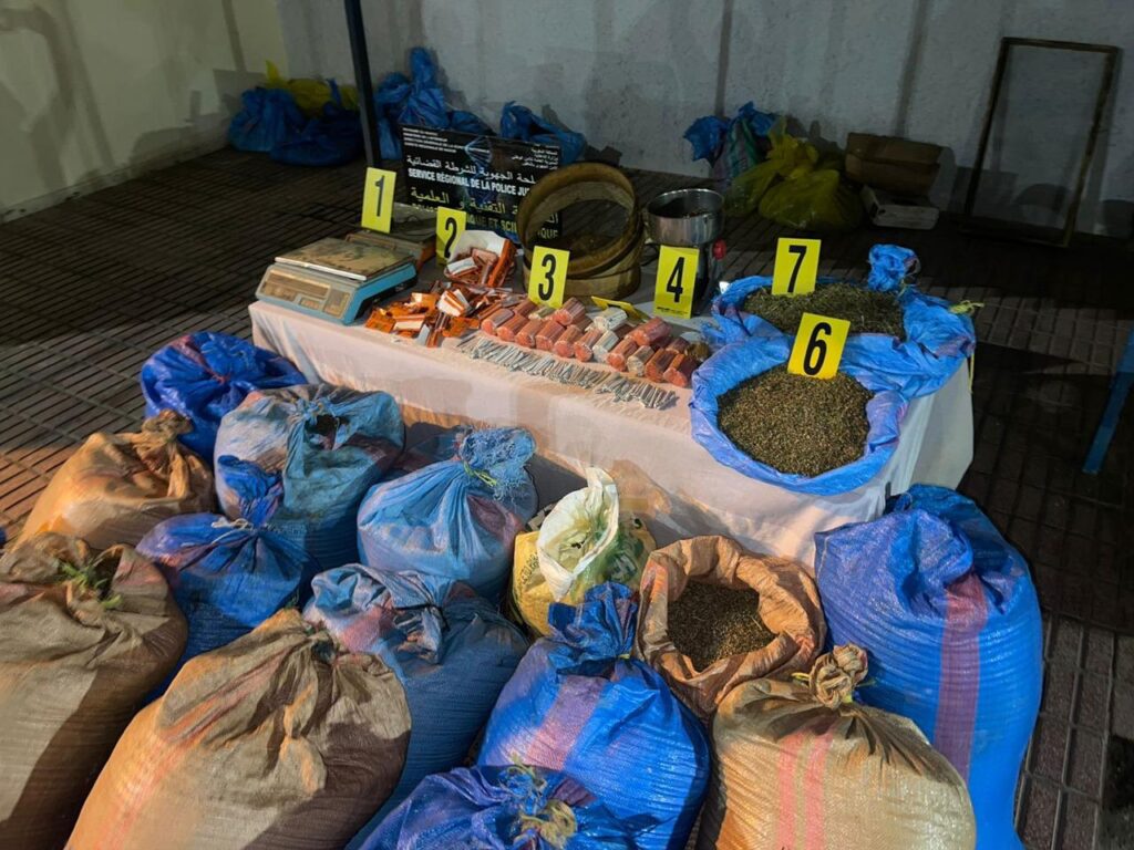 وقد جرى توقيف المشتبه فيهما متلبسين بحيازة وترويج المخدرات، حيث أسفرت عملية الضبط والتفتيش المنجزة بداخل منزل يستغله أحدهما عن حجز 615 كيلوغراما من مخدر الكيف، علاوة على 1330 سيجارة محشوة بالحشيش وأواني ومعدات ومواد تستعمل في إعدادها.