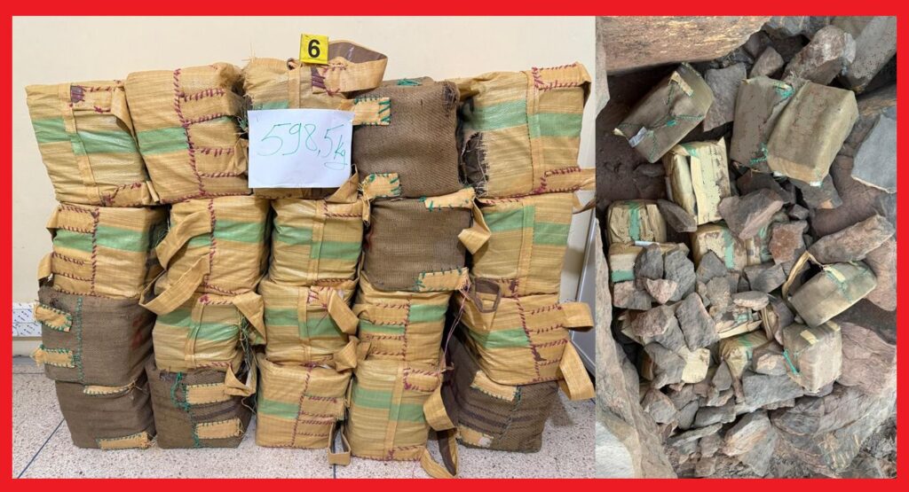 وقد تم تنفيذ هذه العملية الأمنية بتنسيق مع عناصر الدرك الملكي بالمنطقة القروية “فم الحصن”، التي تبعد بحوالي 120 كيلومترا عن مدينة طاطا، وأسفرت عن حجز 20 رزمة من مخدر الشيرا بلغ مجموع وزنها 598 كيلوغراما و500 غراما، والتي تم اكتشافها مخبأة في منطقة صخرية في انتظار عملية تهريبها.