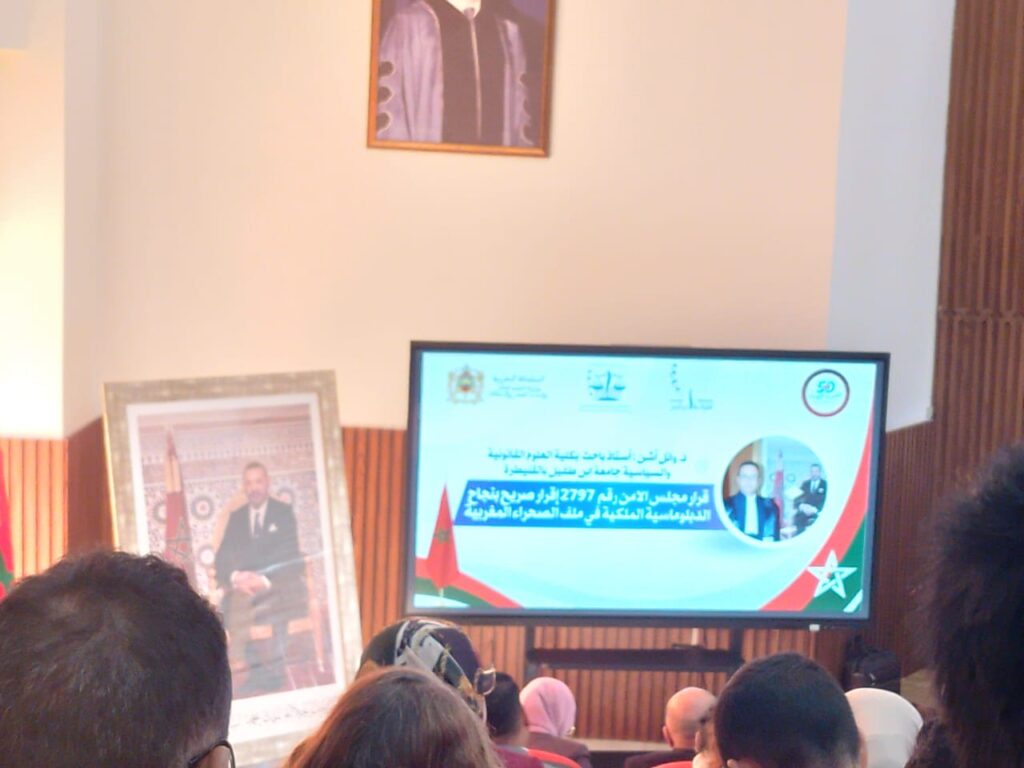 نظمت كلية العلوم القانونية والسياسية بجامعة ابن طفيل بالقنيطرة بمناسبة الاحتفاء بالذكرى الـ 50 للمسيرة الخضراء المظفرة ندوة علمية وطنية تحت موضوع قرار مجلس الأمن 2797 تتويجا للدبلوماسية الملكية والرؤية التنموية بالمناطق الجنوبية الحكم الذاتي بالصحراء المغربية من الشرعية التاريخية الى الترسيخ الاممي، وذلك يوم الثلاثاء 11 نونبر 2025 بمدرج الندوات بكلية الاقتصاد والتدبير بالقنيطرة.