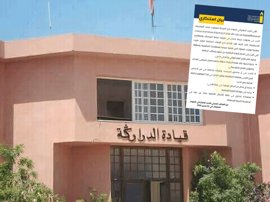 شهدت قيادة الدراركة تصعيداً سياسياً وإدارياً جديداً، بعد أن كشف الفرع المحلي للحزب الاشتراكي الموحد (PSU) عن ممارسات وصفها بـ “المشينة واللاقانونية” من طرف القائد المحلي، النزاع الذي بدأ برفض إداري بسيط، تحول إلى قضية رأي تتعلق بحرية العمل الحزبي واستقلاليته مقابل التعقيدات البيروقراطية، ويهدد الحزب بخطوات نضالية تصعيدية دفاعاً عن حقه في الممارسة السياسية المستقلة.